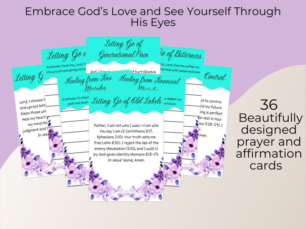 Are you struggling to release the past and step into God’s peace? This set of 36 printable cards — featuring 18 powerful prayers and 18 heartfelt gratitude statements — is designed to guide you on your healing and emotional renewal journey. Rooted in scripture, each card encourages you to let go of regrets, release bitterness, and embrace the freedom God has for you.