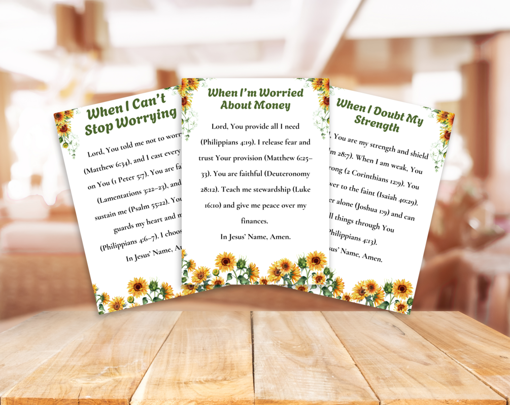 I know how overwhelming anxiety can feel — the racing thoughts, the restless nights, the constant “what ifs.” But I also know how powerful God’s peace can be. I created these 36 Prayer and Gratitude Cards — to help you quiet the noise, refocus your heart, and invite God’s calm into your day.