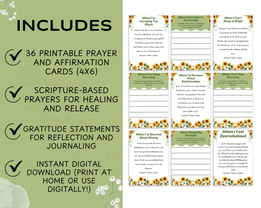 36 Prayer & Gratitude Cards -Transform Anxiety to Peace - Christian Affirmations for Calm Healing - Digital Download Printable