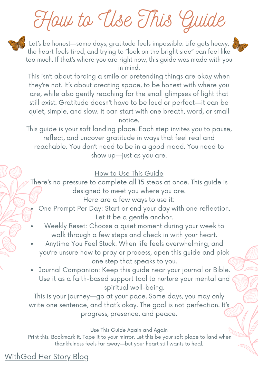 What’s Included: ✨ 15-Step Gratitude Guide (PDF format) ✨ Calming, faith-filled encouragement throughout ✨ Bonus “Encouragement Box” messages to lift your spirit ✨ How-to instructions and suggested ways to use it ✨ Perfect for journaling, morning devotionals, or mental wellness check-ins